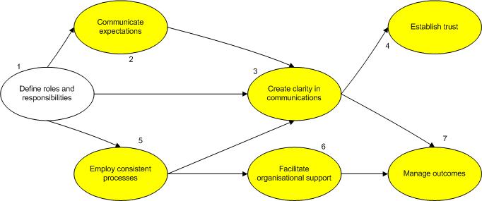 According to the model, managing outcomes depends on all the factor that precede it (excepting establishing trust). That seems logical enough. The author states that other studies on the relationship between trust and performance in collaborative environments also back this claim.