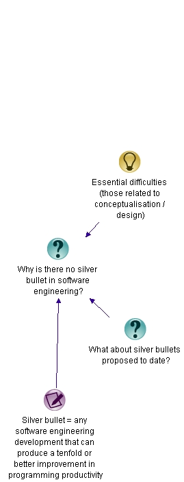 The root node of the map – as in all IBIS maps – is a question node. Responding to the question, we have an idea node (Essential difficulties) and another question node (What about silver bullet solutions proposed to date). We also have a note node which clarifies what is meant by a silver bullet solution.