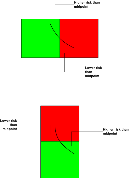 “That’s obvious,” I hear you say – and you’re right. But there’s more: if one of the ratings is medium and the other one is not (i.e. the other one is high or low), then there is a non-zero chance of making an incorrect ranking because some points in the cell with the higher qualitative rating have a lower quantitative value of risk than some points in the cell with the lower qualitative ranking. Look at that statement again: it implies that risk matrices can incorrectly assign higher qualitative rankings to quantitatively smaller risks – i.e. there is the possibility of making ranking errors. This point is seriously counter-intuitive (to me anyway) and merits a proof, which Cox provides and I discuss below. Before doing so, I should also point out that the discussion of this paragraph assumes that the probabilities and impacts of the two risks are independent and uniformly distributed. Cox also points out that the chance of making the wrong ranking can be even higher if the joint distribution of the two are correlated. In particular, if the correlation is negative (i.e. probability decreases as impact increases), a random ranking is actually better than that provided by the risk matrix. In this situation the information provided by risk matrices is “worse than useless” (a random choice is better!). Negative correlations between probability and impact are actually quite common – many situations involve a mix of high probability-low impact and low probability-high impact risks. See the paper for more on this.