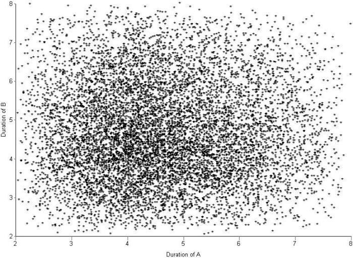 I looked at two cases: the first with no correlation between A and B and the second with a correlation of 0.79 between A and B. Each simulation consisted of 10,000 trials – basically I generated two sets of 10,000 triangularly-distributed random numbers, the first with a correlation coefficient close to zero and the second with a correlation coefficient of 0.79. Figures 2 and 3 depict scatter plots of the durations of A vs. the durations of B (for the same trial) for the uncorrelated and correlated cases. The correlation is pretty clear to see in Figure 3.