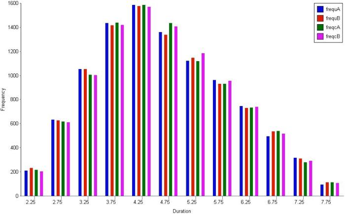 To check that the generated trials for A and B do indeed satisfy the triangular distribution, I divided the difference between the minimum and maximum times (for the individual tasks) into 0.5 day intervals and plotted the number of trials that fall into each interval. The resulting histograms are shown in Figure 4. Note that the blue and red bars are frequency plots for the case where A and B are uncorrelated and the green and pink (purple?) bars are for the case where they are correlated.