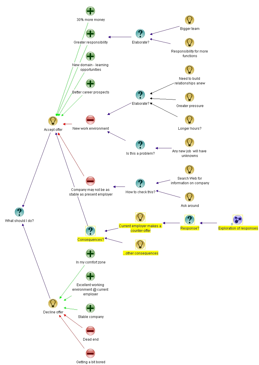 The branch highlighted in yellow shows how we might have explored the consequences of accepting the job. For each consequence one could then consider how one might respond to it. The exploration of responses could be done on the same map or hived off into its own map as I’ve shown in the figure. Note that clicking on a map node in Compendium (the free software tool used to create IBIS maps) simply opens up a new map. Such sub-maps offer a convenient way to organise complex discussions into relatively self-contained subtopics.