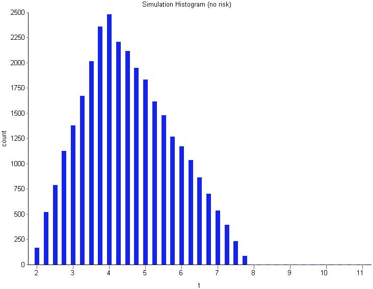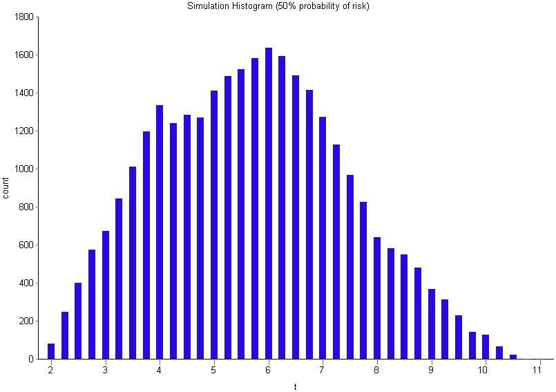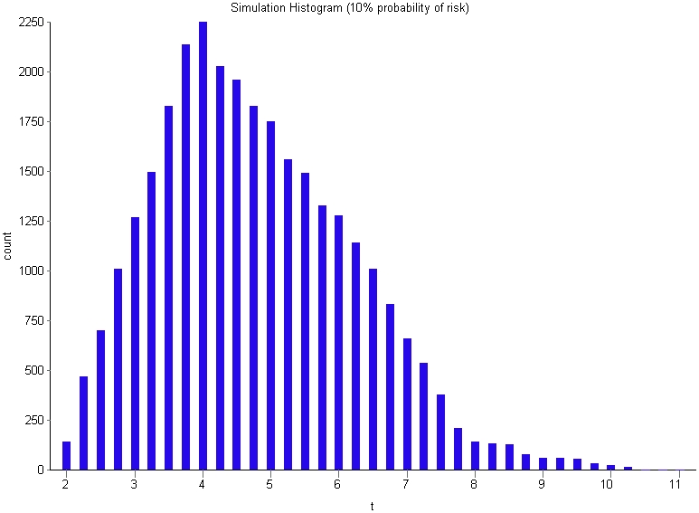 I performed simulations for the task with risk probabilities of 10%, 30% and 50%. The frequency distributions of completion times for these are displayed in Figures 6-8 (in increasing order of probability). As one would expect, the spread of times increases with increasing probability. Further, the distribution takes on a distinct second peak as the probability increases: the first peak is at , corresponding to the most likely completion time of the risk-free task and the second at