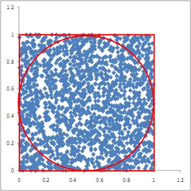 is the radius of the circle (0.5 units in this case). This yields 0.785398 sq units, which is reasonably close to the number that we got for the 1000 trial case. In the 16000 trial case, I get a number that’s closer to the exact result: an average of 0.7860 from 10 sets of 16000 trials.
