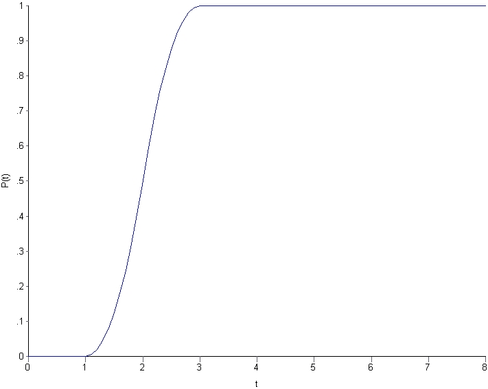 Let’s assume that there’s a task that needs doing, and the person who is going to do it reckons it will take between 2 and 8 hours to complete it, with a most likely completion time of 4 hours. How the estimator comes up with these numbers isn’t important here – maybe there’s some guesswork, maybe some padding or maybe it is really based on experience (as it should be). For simplicity we’ll assume the probability distribution for the task duration is triangular. It is not hard to show that, given the above mentioned estimates, the probability, , that the task will finish at time