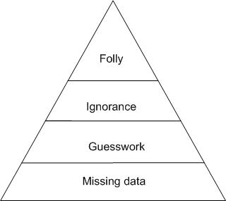Let’s start with incorrect data. Data that is incorrect will mislead, hence resulting in misinformation. Misinformed people end up with false beliefs – i.e. they are deluded. These beliefs can cause them to make foolish decisions that betray a lack of understanding or sense. This gives us the pyramid of delusion shown in Figure 2.