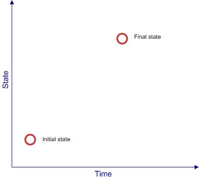 Let’s begin with a two dimensional grid as in Figure 1, with time on the horizontal axis and the state of the organisation along vertical axis (before going any further I should also mention that this model is grossly simplified – among other things it assumes that the state of the organisation can be defined by a single variable). We can represent the current state of a hypothetical organisation by the point marked as the “Initial state” in Figure 1.