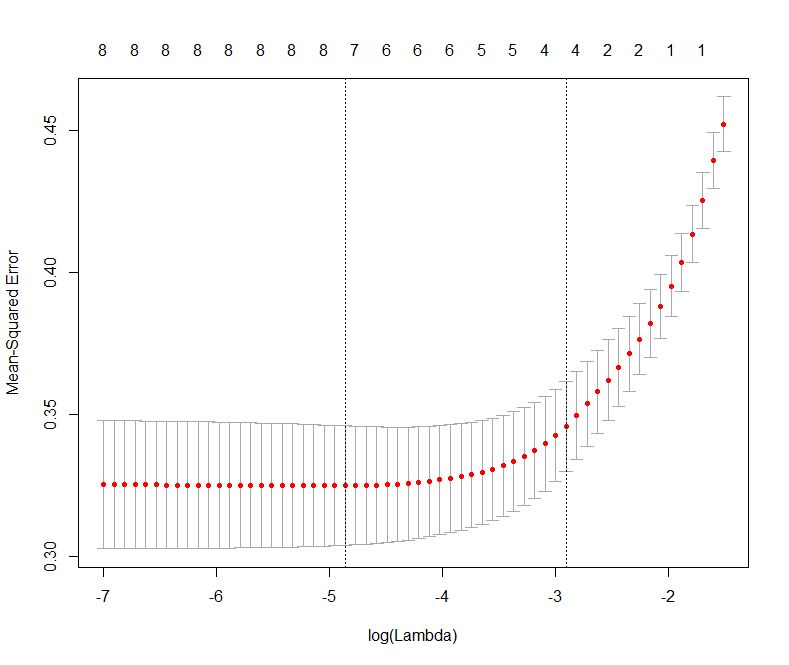 The plot shows that the log of the optimal value of lambda (i.e. the one that minimises the root mean square error) is approximately -5. The exact value can be viewed by examining the variable lambda_min in the code below. In general though, the objective of regularisation is to balance accuracy and simplicity. In the present context, this means a model with the smallest number of coefficients that also gives a good accuracy.  To this end, the cv.glmnet function  finds the value of lambda that gives the simplest model but also lies within one standard error of the optimal value of lambda. This value of lambda (lambda.1se) is what we’ll use in the rest of the computation. Interested readers should have a look at this article for more on lambda.1se vs lambda.min.