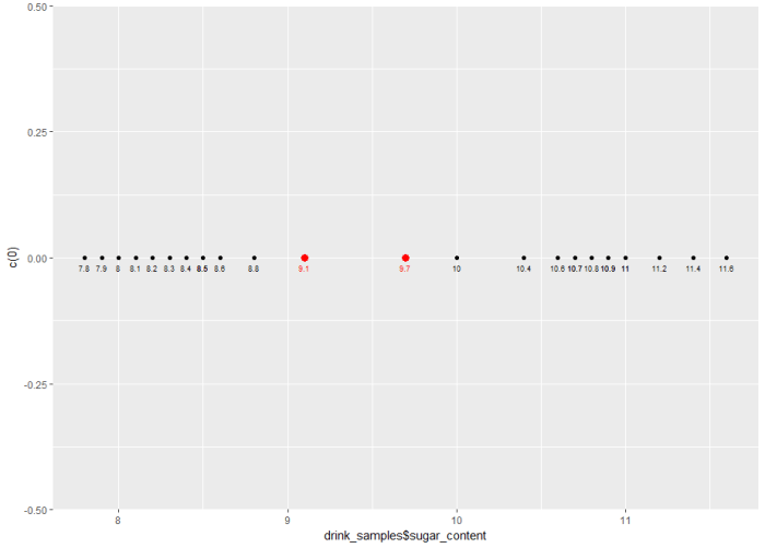 Clearly, any point that lies between the two points is an acceptable decision boundary. We could, for example, pick 9.1g/100ml and 9.7g/100ml. Here’s the R code with those points added in. Note that we’ve made the points a bit bigger and coloured them red to distinguish them from the sample points.