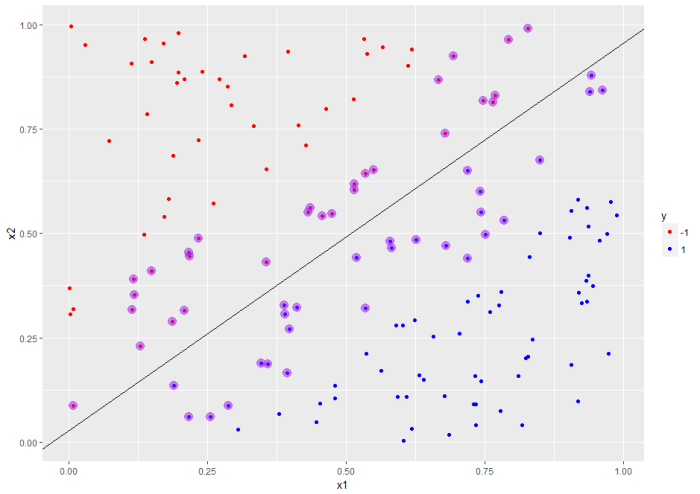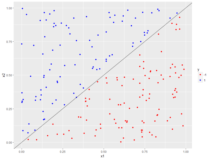 Now let’s classify the points that lie above the line x1=x2 as belonging to the class +1 and those that lie below it as belonging to class -1 (the class values are arbitrary choices, I could have chosen them to be anything at all). Here’s the R code: