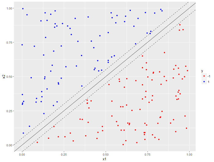 Note that the axes are switched (x1 is on the y axis). Aside from that, the plot is reassuringly similar to our ggplot version in Figure 9. Also note that that the support vectors are marked by “x”. Unfortunately the built in function does not display the margin boundaries, but this is something we can easily add to our home-brewed plot. Here’s how. We know that the margin boundaries are parallel to the decision boundary, so all we need to find out is their intercept. It turns out that the intercepts are offset by an amount 1/w[2] units on either side of the decision boundary. With that information in hand we can now write the the code to add in the margins to the plot shown in Figure 9. Here it is: