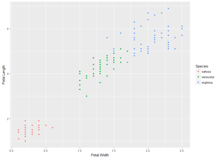 Now, as it turns out, petal length and petal width are the key determinants of species. So let’s create a scatterplot of the datapoints as a function of these two variables (i.e. project each data point on the petal length-petal width plane). We will also distinguish between species using different colour. Here’s the ggplot code to do this: