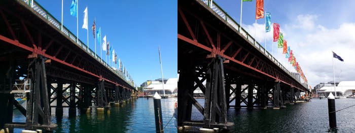 The photographs in Figure 5 were taken at Pyrmont Bridge about four hours into the walk. We already know from Figure 4 that it was considerably windier in 2018. A comparison of the flags in the two shots in Figure 5 reveal an additional detail: the wind was from opposite directions in the two years. This is confirmed by the weather information in Figure 2, which also tells us that the wind was from the north in 2017 and the south the following year (which explains the cooler conditions). We can even get an approximate temperature: the photographs were taken around 11:30 am both years, and a quick look at Figure 2 reveals that the temperature at noon was about 30 C in 2017 and 18 C in 2018.