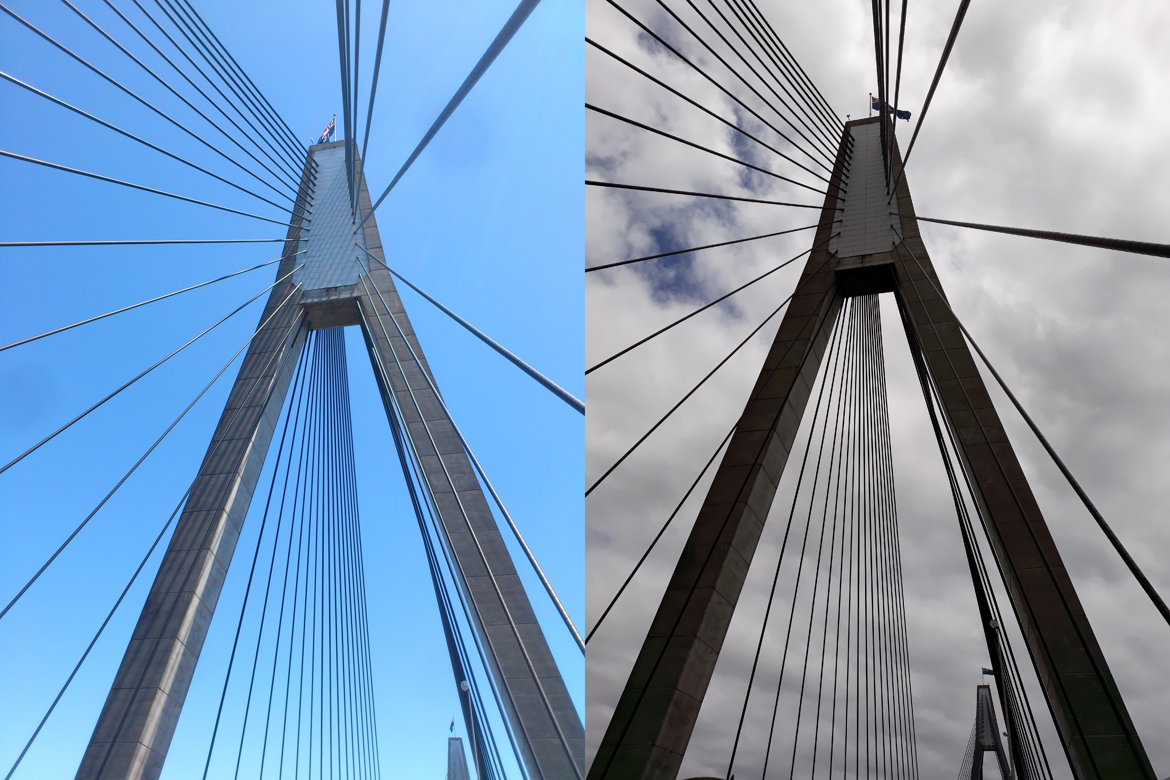The point about the wind direction and cloud conditions is also confirmed by comparing the photographs in Figure 6, taken at Anzac Bridge, a few kilometres further along the way (see the direction of the flag atop the pylon).