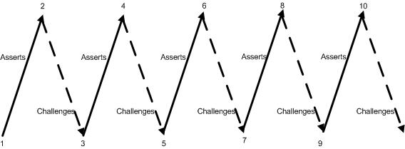 The relationship is defined by how participants perceive a sequence of exchanges: A dialogue consists of a sequence of exchanges between participants. However, the participants will punctuate the sequence differently. What the word punctuate means in this context can be made clear by referring back to our example above. If the team member feels (from previous experience) that the manager’s query is an assertion of authority, he may respond by challenging the basis of the question. For instance, he may say that he had to deal with other work that was more important. This may provoke the project manager to assert his authority even more strongly, thereby escalating discord…and so on. This leads to a situation that can be represented graphically as shown in Figure 1.