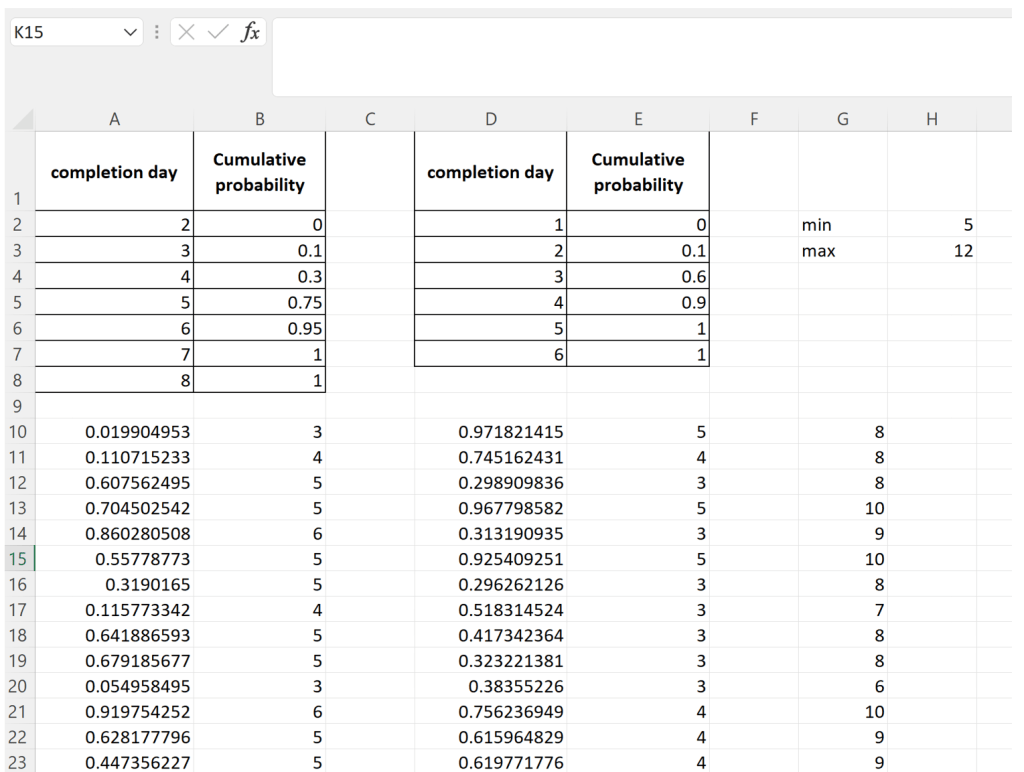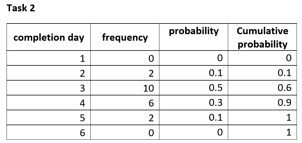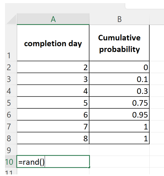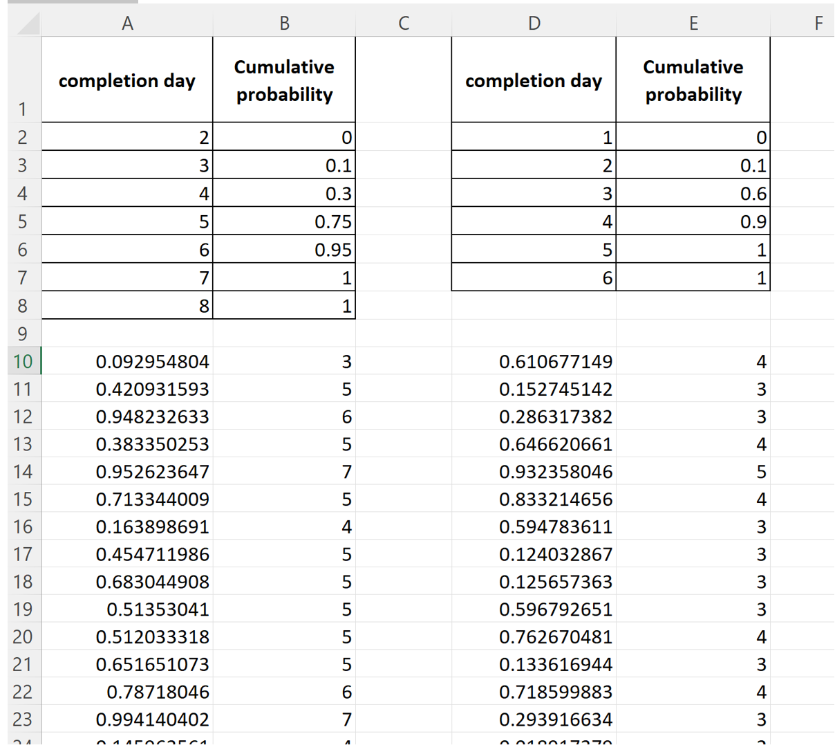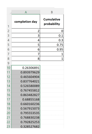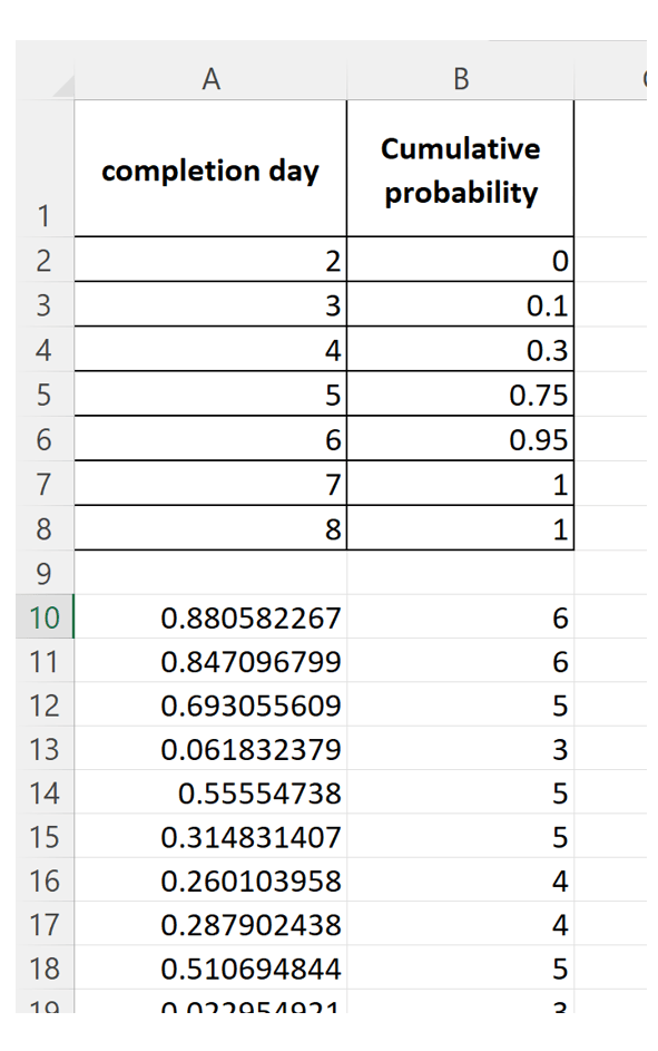 ….and so on. It is easy to see that any random number between 0 and 1 corresponds to a specific completion day depending on which cumulative probability interval it lies in.