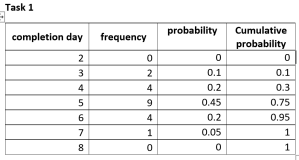 Assume the project has been carried a number of times in the past – say 20 times – and we have the data shown below for the two tasks. For each task, we have the frequency of completion by day. So, Task 1 was completed twice on day 3 , four times on day 4 and so on. Similarly, Task 2 was completed twice on the 2nd day after the task started and 10 times the 3rd day after the task started and so on.