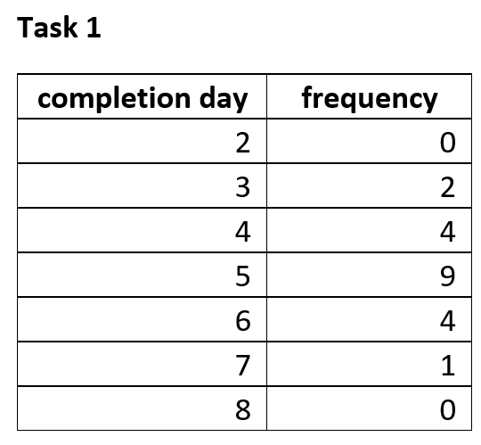 Consider Task 1. Since it was completed 2 times on day 3 and 4 times on day 4, it is reasonable to assume that it twice as likely that it will finish on day 4 than on day 3. In other words, the number of times a task is completed on a particular day is proportional to the probability of finishing on that day.
