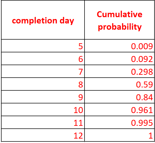 It is straightforward to calculate the probability for each of the completion days. The tables displayed below show the calculated probabilities. The tables also show the cumulative probability – this is sum of all probabilities of completion prior to (and including) current completion day. This gives the probability of finishing by the particular day – that is, on that day or any day before it. This, rather than the probability, is typically what you want to know.