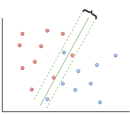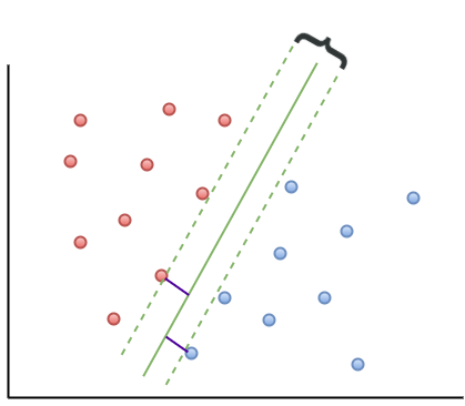 In the linearly separable case, there is usually a fair amount of freedom in the way a separating line can be drawn. Figure 2 illustrates this point: the two broken green lines are also valid separation boundaries. Indeed, because there is a non-zero distance between the two closest points between categories, there are an infinite number of possible separation lines. This, quite naturally, raises the question as to whether it is possible to choose a separation boundary that is optimal.