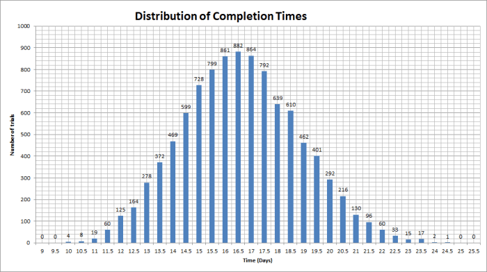 Despite the bad rap spreadsheets get from tech types – and I have to admit that many of their complaints are justified – the fact is, Excel remains one of the most ubiquitous “computational” tools in the corporate world. Most business professionals would have used it at one time or another. So, if you you’re a project manager and want the rationale behind your estimates to be accessible to the widest possible audience, you are probably better off presenting them in Excel than in SPSS, SAS, Python, R or pretty much anything else. Consequently, the tool I’ll use in this article is Microsoft Excel. For those who know about Monte Carlo and want to cut to the chase, here’s the Excel workbook containing all the calculations detailed in later sections. However, if you’re unfamiliar with the technique, you may want to have a read of the article before playing with the spreadsheet.