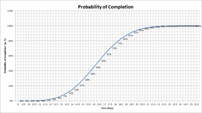 [Aside: you may have noticed that all the distributions shown above are skewed to the right – that is they have a long tail. This is a general feature of distributions that describe time (or cost) of project tasks. It would take me too far afield to discuss why this is so, but if you’re interested you may want to check out my post on the inherent uncertainty of project task estimates.