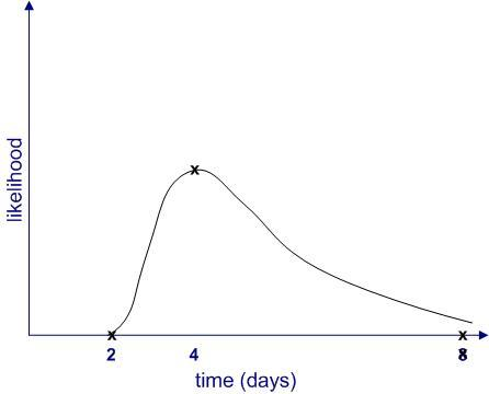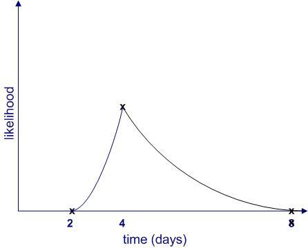 - How can one quantify the likelihood of intermediate times? In other words, how can one get a numerical value of the likelihood for all times between 2 to 8 days? Note that we know from the earlier discussion that this must be zero for any time less than 2 or greater than 8 days.